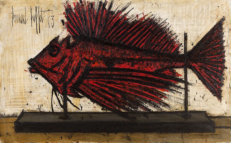 Datée de 1963, cette œuvre s’inscrit dans une période où Bernard Buffet multiplie les représentations du règne animal et des natures mortes. Ces sujets, qu’il aborde avec la même rigueur graphique que ses figures ou ses paysages, deviennent chez lui des icônes saisissantes. Le poisson, dressé sur son socle, prend l’allure d’un spécimen, entre curiosité scientifique et vision tragique, révélant autant la fascination de l’artiste pour la beauté étrange du vivant que son désir d’en souligner la puissance expressive.