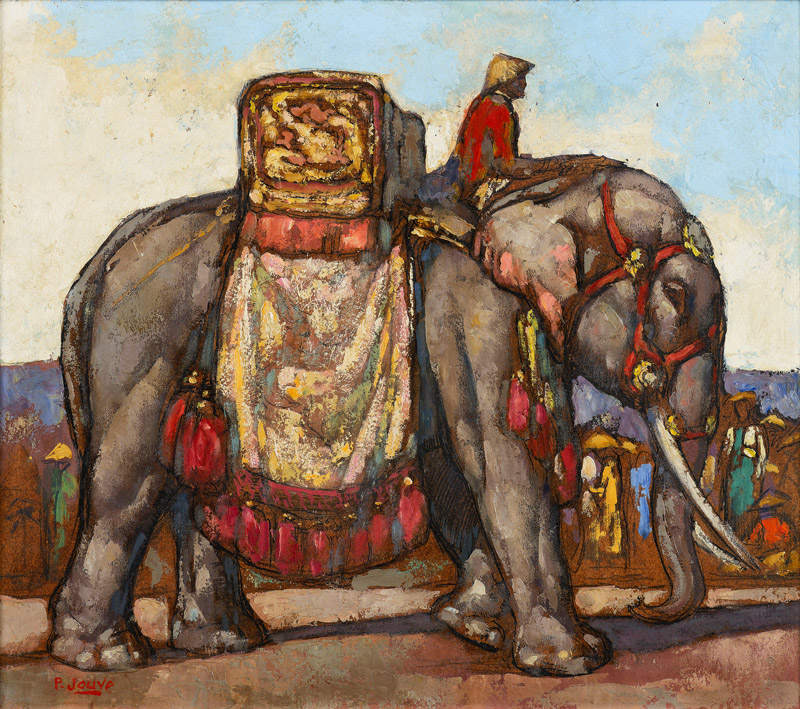 Cette peinture d'un éléphant caparaçonné avec son cornac a été faite sur le motif par Jouve, dans la ville impériale de Hué, en décembre 1922. C’est à la fin de l’année 1922 que Jouve séjourne à Hué, après avoir visité Ceylan, la Malaisie, la Cochinchine, l’Annam et Angkor, dans le cadre du voyage permis par l’obtention de la bourse du Gouvernement Général d’Indochine en 1921. Jouve conservera sa vie durant cette peinture dans son atelier, puis l’offrira à Mlle Mollet le 1er janvier 1968, qui deviendra par la suite sa femme, Roberte Jouve. Cette peinture lui est dédicacée au dos.