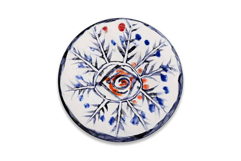 Plat rond en terre de faïence blanche, décor aux engobes et émail, couteau gravé sous glaçure, inscrit et numéroté au dos : Édition Picasso n°7, 19/150, Madoura. Diamètre : 25 cm. Edition de 150 pièces