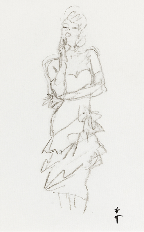 Etude pour une illustration parue dans Madame Figaro, 15 mars 1986, modèle d'une robe Jean-Louis Scherrer.